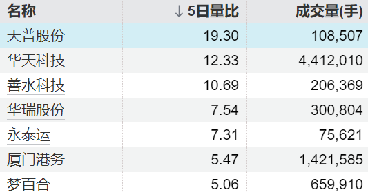 7只个股5日量比超过5倍7只个股5日量比超过5倍